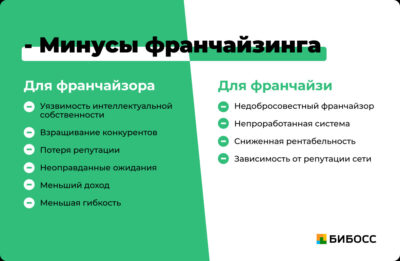 * Конкуренция внутри сети: Вы конкурируете с другими франчайзи той же сети, что может ограничивать возможности для роста и развития.