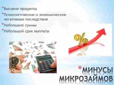 Высокие процентные ставки: Микрозаймы обычно имеют гораздо более высокие процентные ставки, чем традиционные кредиты. Это связано с тем, что микрокредитные компании берут на себя больший риск при предоставлении кредита людям с плохой кредитной историей.